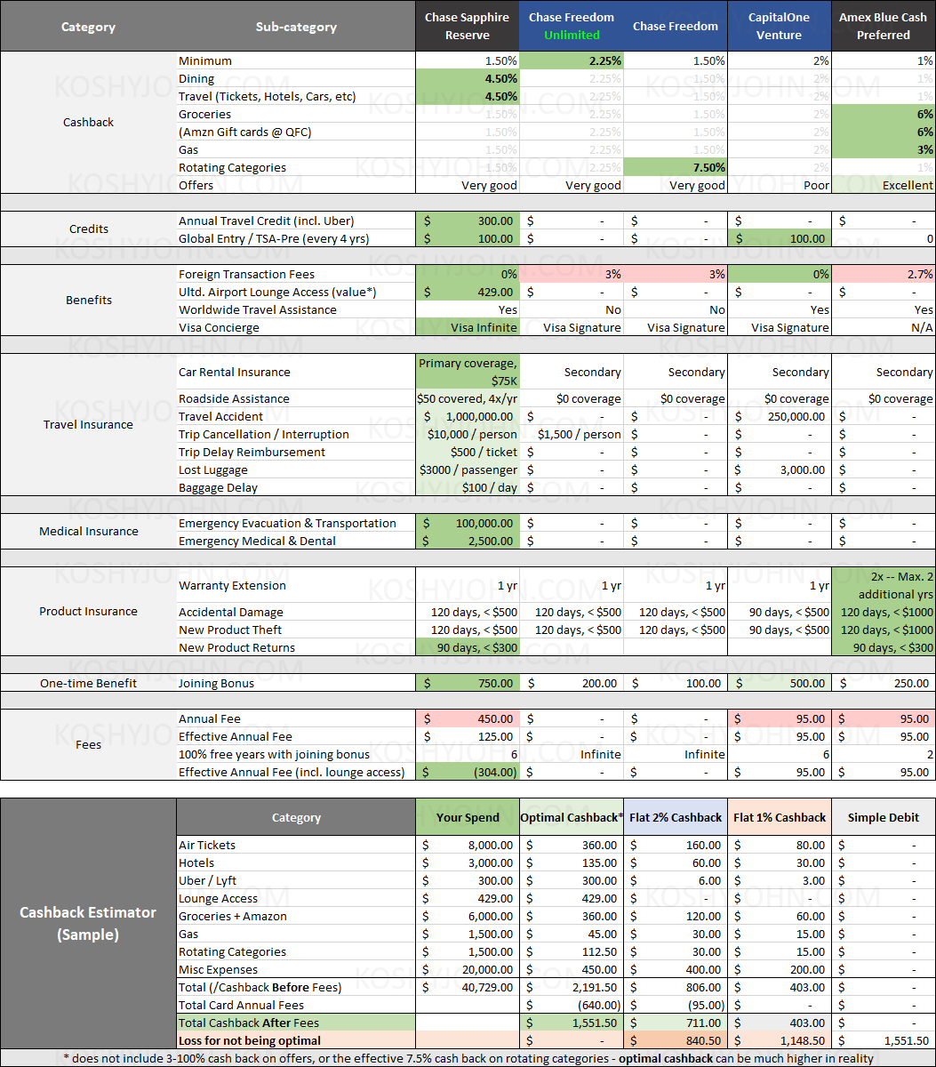 Please note that the rewards listed against the Chase Freedom Unlimited and Freedom cards are marked 50% higher as transferring the reward points over to the Reserve card before spending it on travel nets you 50% more.